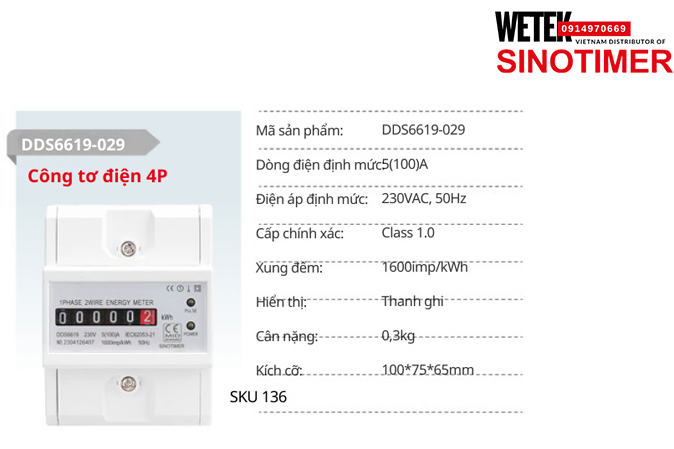 (SKU 136) DDS6619-029 Công tơ điện 5(100)A 230VAC, 50Hz Sinotimer