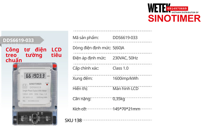 (SKU 138) DDS6619-033 Công tơ điện 5(60)A 230VAC, 50Hz Sinotimer