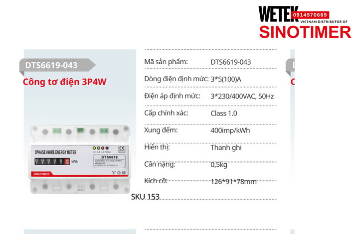 (SKU 153) DTS6619-043 Công tơ điện 3*5(100)A 3*230/400VAC, 50Hz Sinotimer