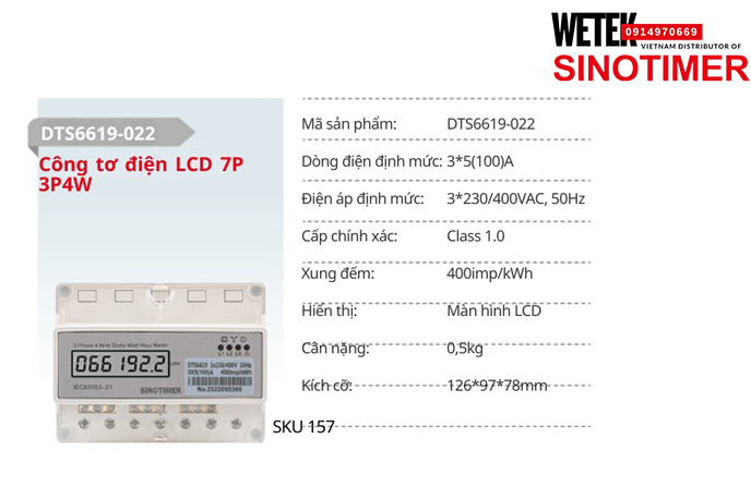 (SKU 157) DTS6619-022 Công tơ điện 3*5(100)A 3*230/400VAC, 50Hz Sinotimer