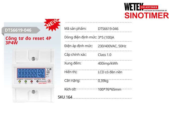 (SKU 164) DTS6619-046 Công tơ điện 3*5 (100)A 230/400VAC, 50Hz Sinotimer
