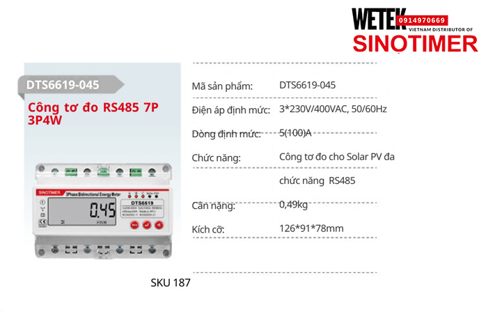 (SKU 187) DTS6619-045 Công tơ điện 3*230V/400VAC, 50/60Hz 5(100)A Sinotimer