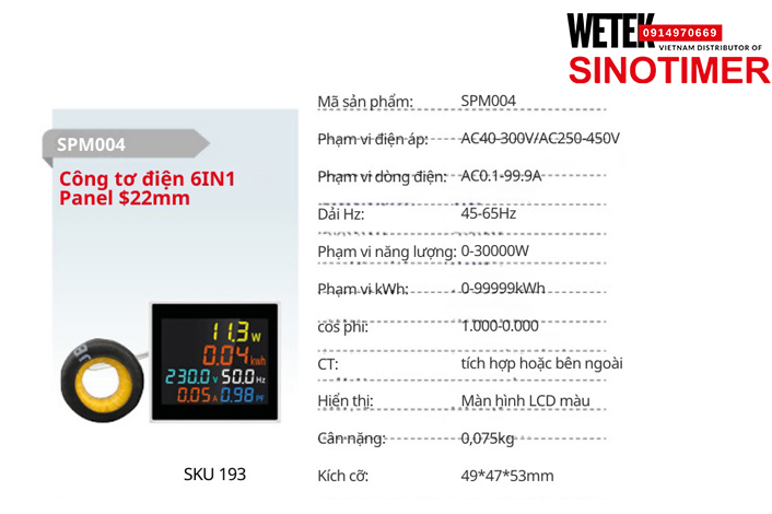 (SKU 193) SPM004 Đồng hồ điện AC40-300V/AC250-450V AC0.1-99.9A Sinotimer
