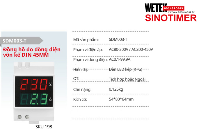 (SKU 198) SDM003-T Đồng hồ điện AC80-300V / AC200-450V AC0.1-99.9A Sinotimer