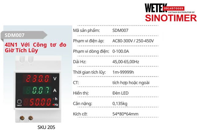 (SKU 205) SDM007 Đồng hồ điện AC80-300V / 250-450V 0-100.0A Sinotimer