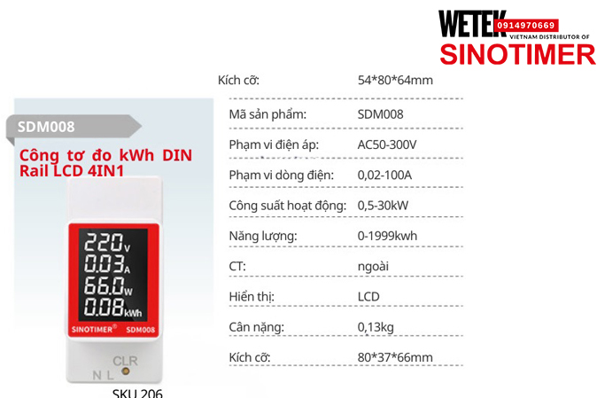 (SKU 206) SDM008 Đồng hồ điện AC50-300V 0,02-100A Sinotimer
