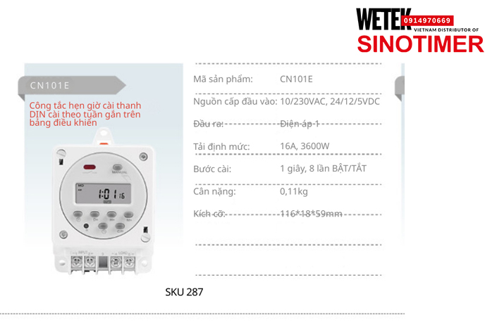 (SKU 287) CN101E Công tắc hẹn giờ 110/230VAC, 24/12/5VDC đầu ra kiểu Điện áp 16A, 3600W Sinotimer