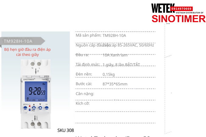 (SKU 308) TM928H-10A Công tắc hẹn giờ 85-265VAC, 50/60Hz đầu ra kiểu Điện áp 10A Sinotimer