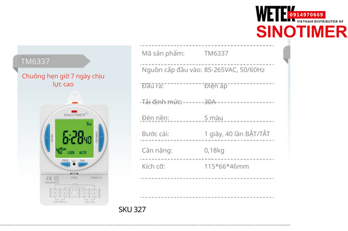 (SKU 327) TM6337 Công tắc hẹn giờ 85-265VAC, 50/60Hz đầu ra kiểu Điện áp 30A Sinotimer