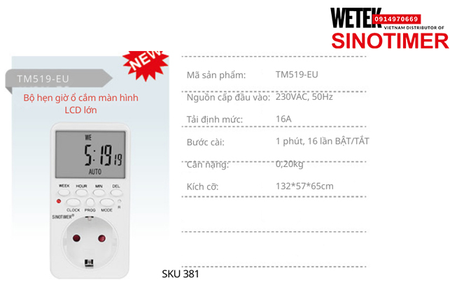 (SKU 381) TM519-EU Công tắc hẹn giờ ổ cắm 230VAC, 50Hz 16A bước cài 1 phút, 16 lần BẬT/TẮT Sinotimer